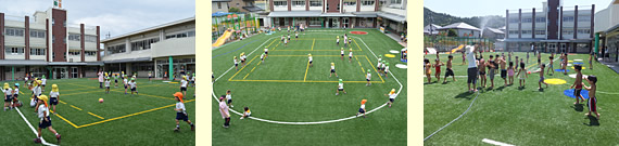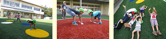 「相撲の土俵」「長いけんけんぱ」「ジグザグライン」などカラー人工芝による遊具がいっぱい。かけっこやボール遊びはもちろん、いろんな遊びが思いっきり楽しめる多目的な園庭になりました。