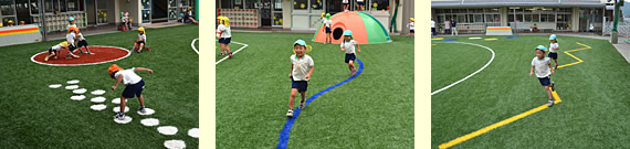 ラインやマークも全て色違いの人工芝で、しかも独自のデザインやレイアウトが可能です。いろんな仕掛けを作ることで、園児のみなさんが自分たちで考えた遊びが生まれてくるはずです。
